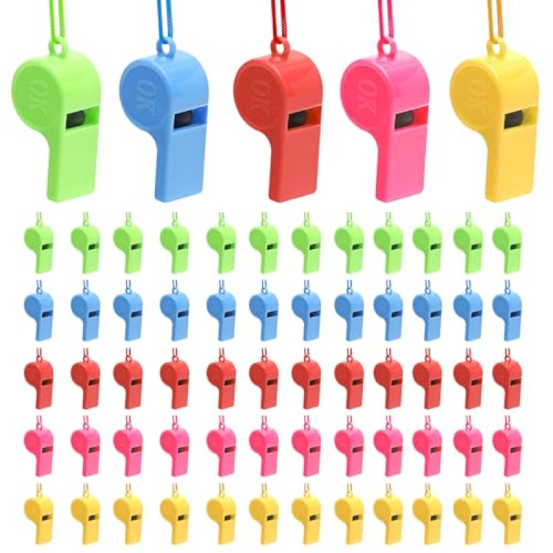- Includes 60 whistles in 5 bright colours: red, pink, blue, green, yellow